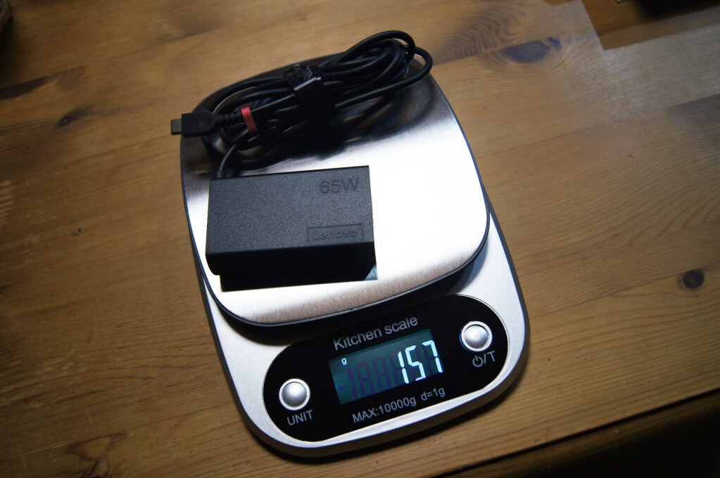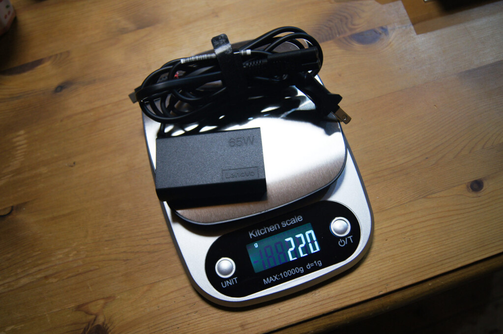 同梱されていた、カスタマイズメニューによると「65W USB Type-C スリム GaN ACアダプター」と記載されているアダプターは、直販サイトで「ThinkPad 65W USB Type-C スリム ACアダプター」として売られているもののようです。約2 mのUSB Type-Cケーブルが直付けされている状態で157 g、ACケーブルを含めても220 g(いずれも実測値)というのは、標準添付品としては相当軽い部類でしょう。