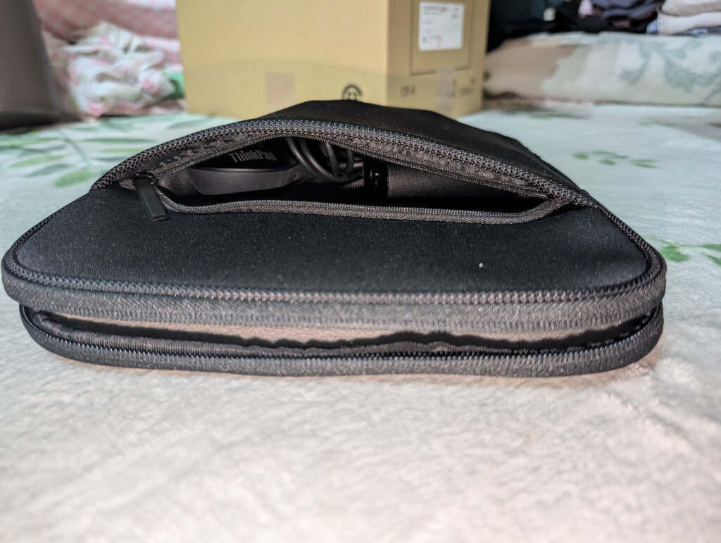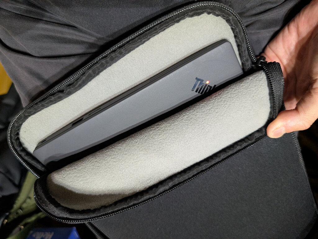 ケースの内側は、ソフトな起毛素材となっていて、大事なThinkPadに傷が付かないように守ってくれそうです。側面にジッパー付きの大きなポケットがあり、マウスとACアダプターくらいなら余裕で入ります。