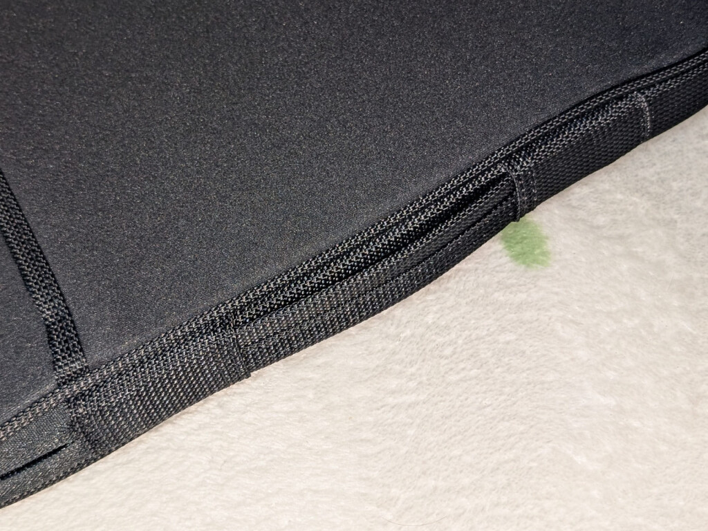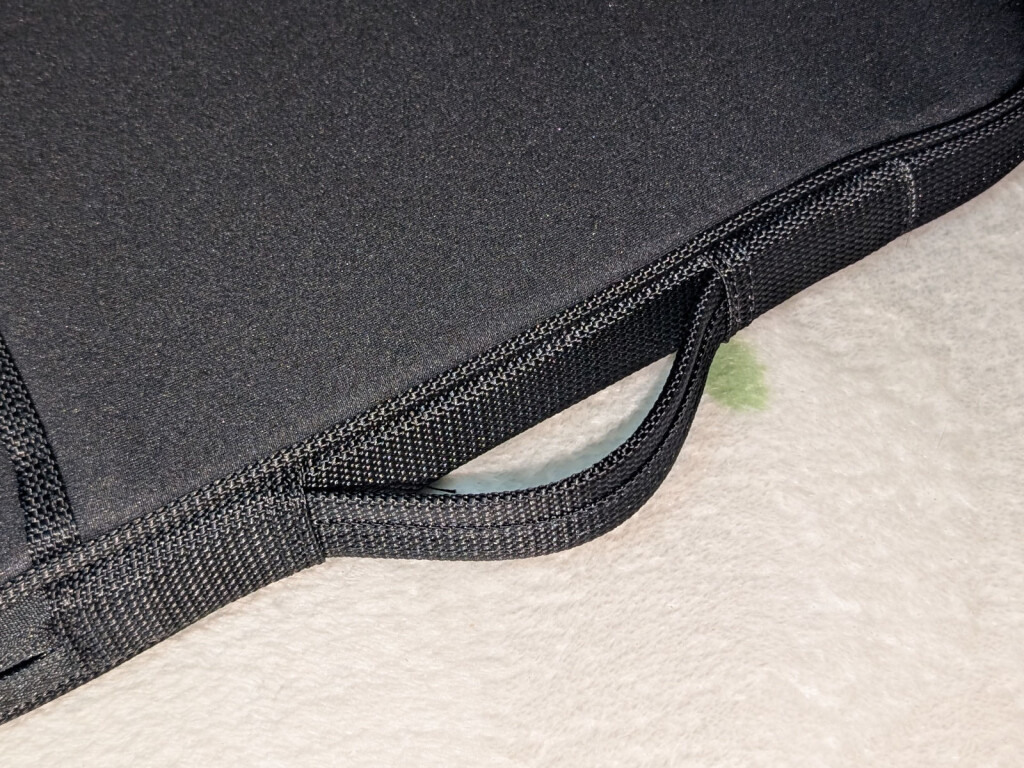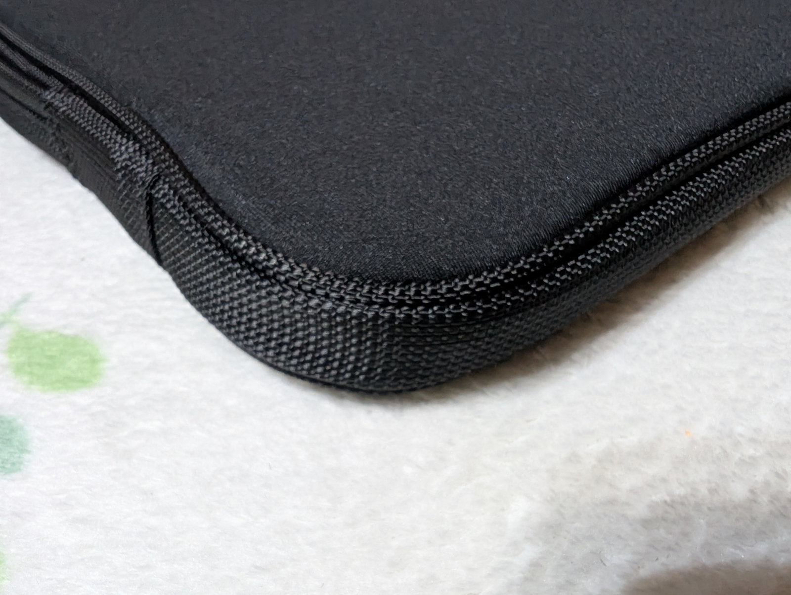 この手のケースは、ずいぶん昔からいろいろなメーカーが販売していますが、ThinkPadのスリーブケースは、縁の部分が実に強靱に作られているのが印象的です。内側には樹脂製の芯が入っていて、そこを太い繊維で編まれた生地が覆っています。特に側面や角は落下させた際に衝撃が集中する可能性がありますから、ここを重点的に守らなくてはなりません。よく「わかっている」作りです。