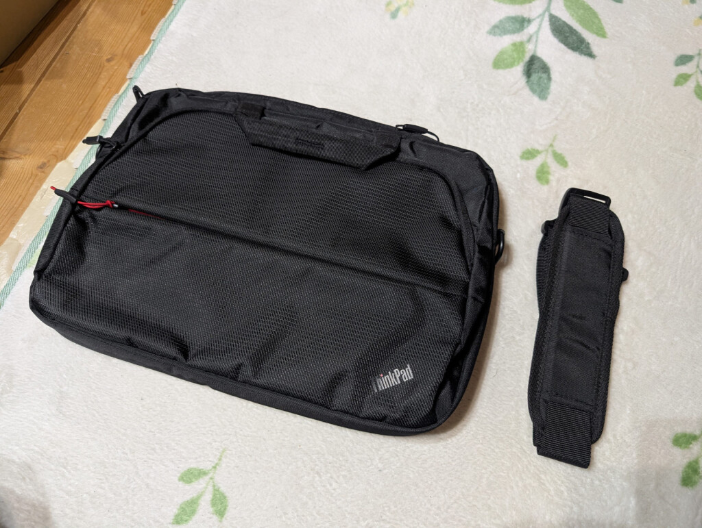 もうひとつが、「ThinkPad エッセンシャル 13/14インチ スリムトップロードケース」。こちらは、単独で持ち歩くことを想定した、「ちょっとしたお出かけ用の鞄」として期待しています。ThinkPadのロゴは控えめな黒で印刷されていますが、こちらも赤ポッチは健在です。手提げのハンドルが付いている他、取り外し可能な肩掛け用のストラップも付属しています。