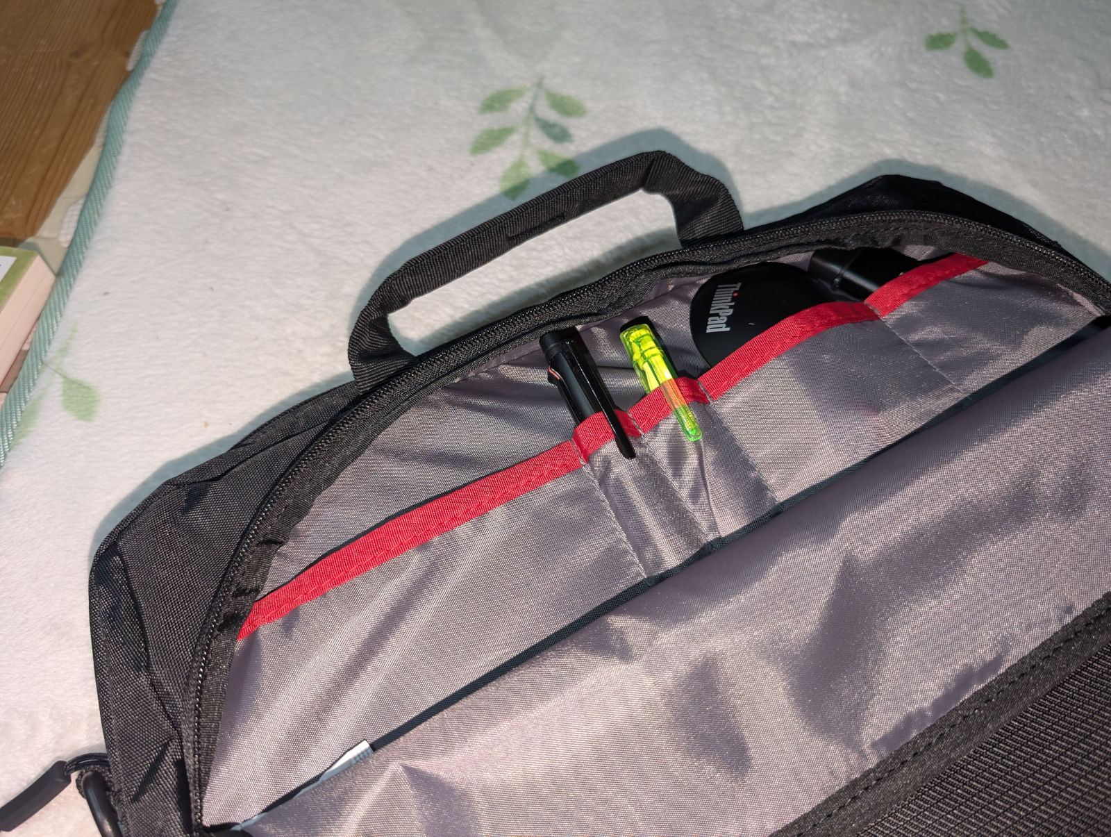 側面には2つのジッパー付きのポケットがあり、上段はペンを挿したり、マウスなどの小物を区分けして入れたりできるオーガナイザー的な作りになっています。下段は単一のポケットになっていて、ACアダプターやスマホなら収まりそうです。随所に入った赤い差し色が、ThinkPadらしさを主張しています。全体としては大容量とは言えませんが、日帰りの荷物なら何とかなりそうです。