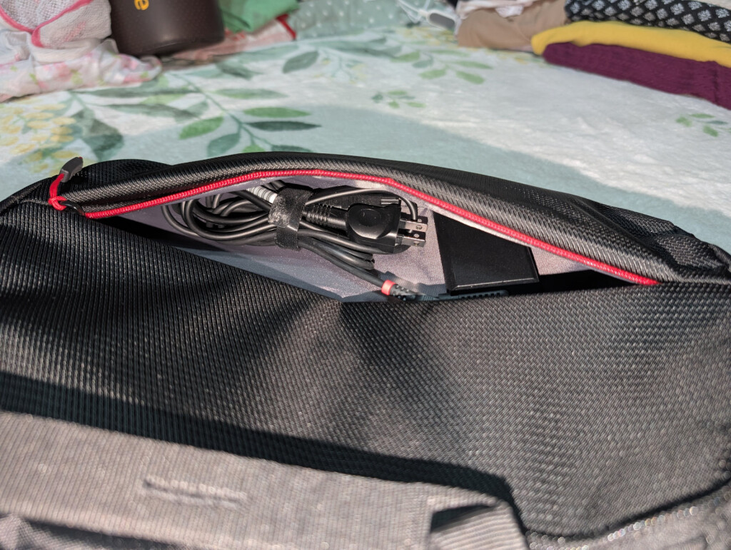 他の接続アダプターやケーブルも詰められそうですが、小部屋に分かれたりはしていないので、あまり突っ込みすぎると何を入れたのかわからなくなったり、必要なものを探すのに苦労したりしそうです。ポーチやオーガナイザーに収めてここに突っ込む、というのはアリかもしれません。