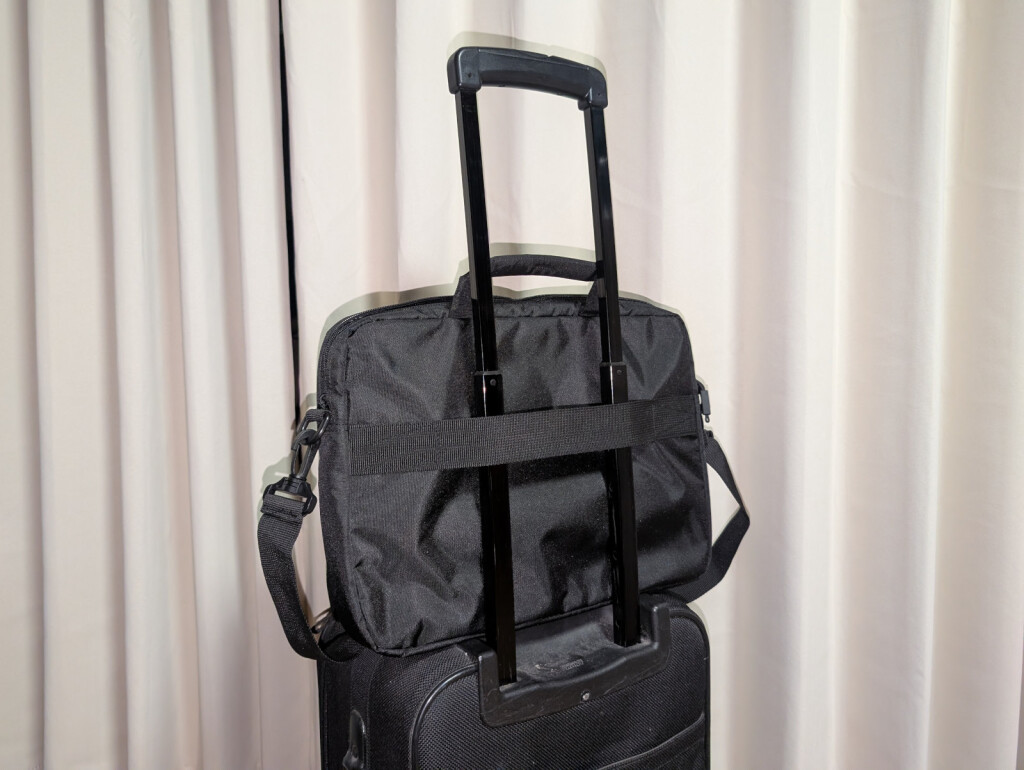 背面には横一線にバンドが張られていて、これはキャリーケースの把手に通し、一緒に引っ張って転がせるようになっています。日帰り専用とは言わず、泊まりがけの出張でも出番があるかもしれません。