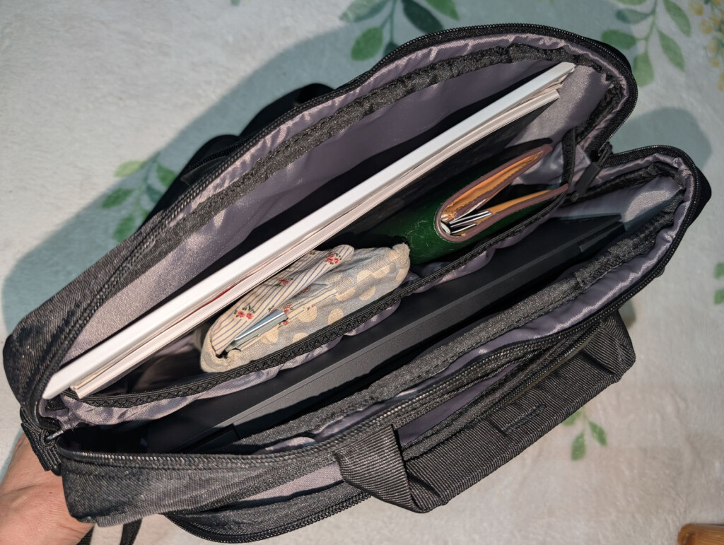 中にはPC収納用の区画が用意されています。「13/14インチ」を名乗るだけあって、13型画面のThinkPad X13 Gen 6 Intelは十分余裕を持って収まり、もう片方の区画には、A4サイズのファイルや財布などの小物が入るくらいのスペースが残ります。