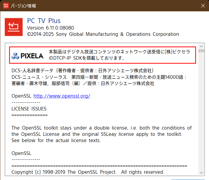 ちなみに、PC TV Plusのバージョン情報によると、DTCP-IP関連の部分には「(株)ピクセラのDTCP-IP SDKを搭載しております」と説明されています。PC用テレビチューナーでは実績のあるメーカーで、Microsoftストアアプリの「StationTV Link」も提供しています。当時はちょっと不安定な挙動も気になっていましたが、このPC TV Plusに関しては問題は感じません。