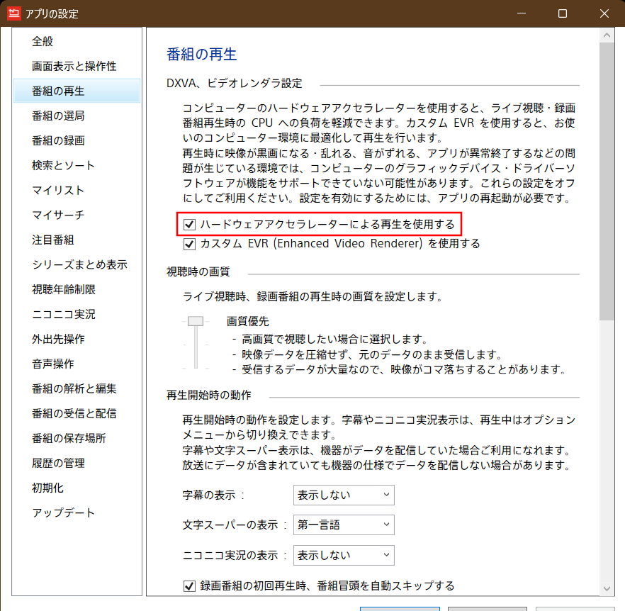 アプリの設定によると、番組の再生に「ハードウェアアクセラレーターによる再生を使用する」という設定が標準で有効になっていて、Intel Arc 140T GPUの動画再生支援機能はちゃんと使われているようです。緑の砂嵐のsMedio TV Suiteとどこが違うのかはよくわかりませんが、こうなってくると、sMedio TV Suite側に問題がありそうだなぁ…。