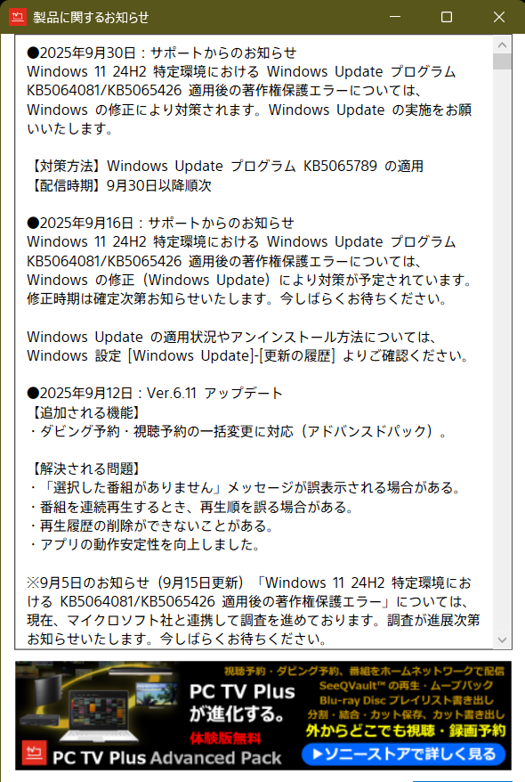 もうひとつ、どうしても触れておきたいのが、年に数回の頻度でアップデートブログラムが提供され続けていること。最新版は、先月(2025年9月)に公開されています。KB5065426(とその前の非セキュリティプレビュー更新のKB5065081)で著作権エラーが発生し、KB5065789で解決している経過も、アプリのお知らせで確認できます。sMedio TV SuiteやWindows 10のような「静かに余生を送っている」状況のアプリとは違い、これから購入しても、しばらくは安心して使い続けられそうです。