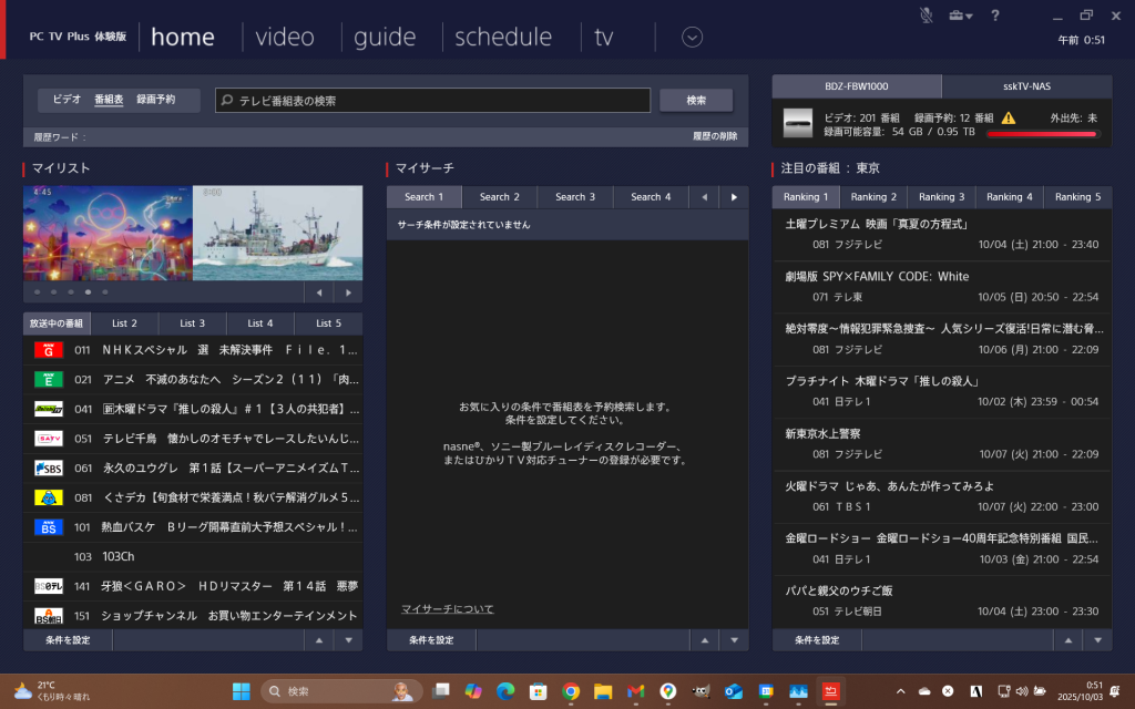 と明記されていて、自社製品で囲い込むわけではなく、DLNA・DTCP-IPによるオープンな対応になっているようです。もちろん、我が家のソニー製ブルーレイレコーダー・BDZ-FBW1000は動作確認済み機器一覧に掲載されていて、安心感があると共に、ソニー謹製ソフトウェアとの組み合わせならではの多彩な機能への対応にも期待できます。製品ページから、14日間全機能を使用できる体験版がダウンロードできるので、ちょっと試してみることにしました。