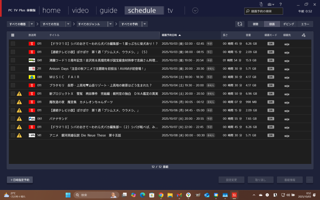 「guide」は、ブルーレイレコーダーの番組表を表示し、番組をクリックして開くと、その番組を視聴したり、録画予約したりできます。「schedule」は、指定したレコーダーで録画予約されている番組一覧です。我が家のブルーレイレコーダーは、今ハードディスクの空き容量が逼迫しているので、途中から「予約が録画できない可能性があります」と警告が表示されています。この画面から予約を取り消すこともできます。そもそも目的が異なるアプリとはいえ、sMedio TV Suiteよりもはるかに多機能です。