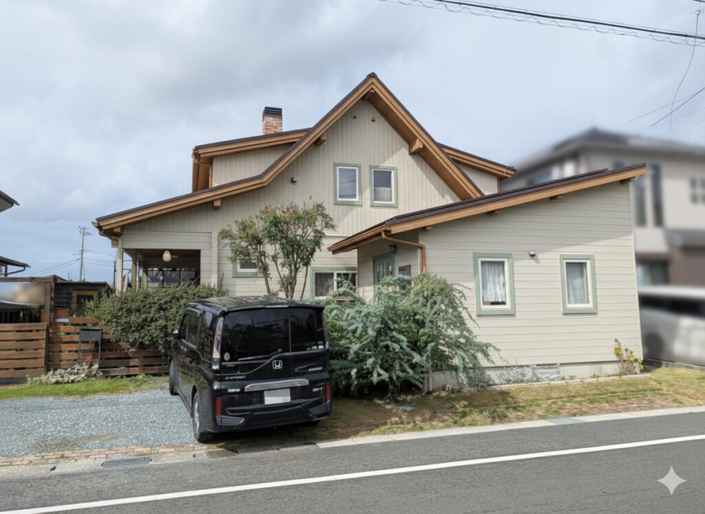 それなら、色はガラリと変えてしまおう!ということでお願いしたのが、こんな配色。アイボリー色の外壁で、窓などの縁取りには淡い緑色を配しています。Geminiさんにまた完成予想図をお願いしてみましたが、これはこれで、なかなかオシャレな雰囲気に仕上がりそうでイイ感じです。