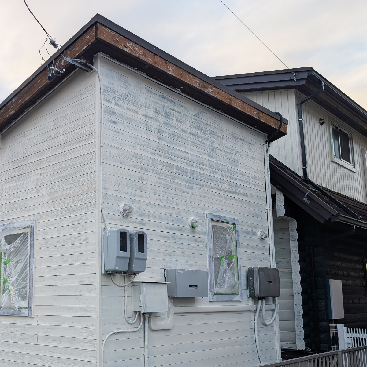 前回試し塗りして確認していましたが、北側は板壁表面の劣化が東側よりもかなりマイルドなこともあり、作業はスムーズに進みました。東側を塗ったときには、下塗りでまる一日かかってしまいましたが、今回は昼過ぎから始めて、夕方までには母屋の角のログ組が出っ張ったところまで塗り、片付けもちゃんと済ませることができました。目論見通りのペースです。