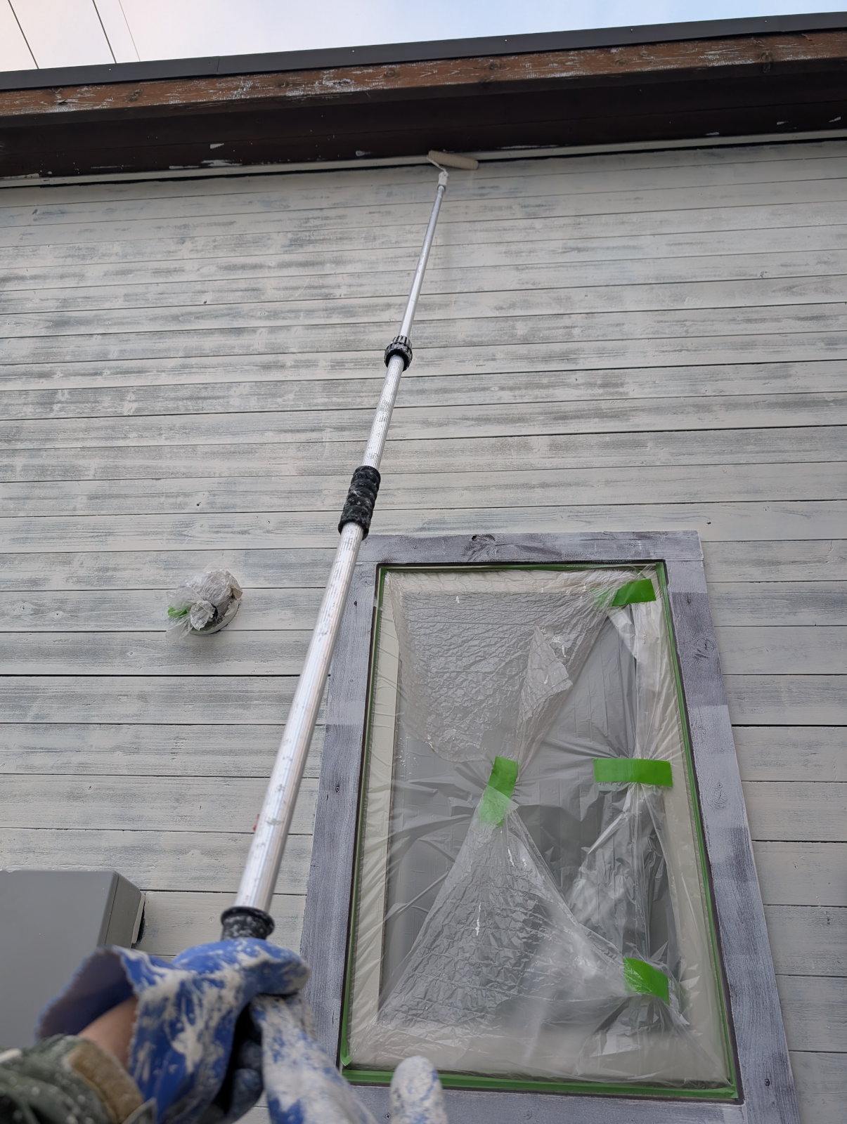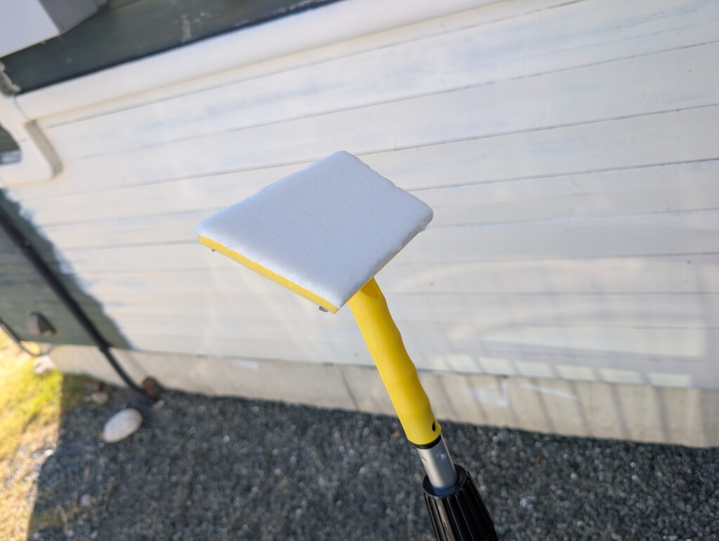 ただ、これだと壁の上端の境目をキレイに塗ることはできません。そこで、このポールに取り付けられるコテバケも合わせて用意しました。地上から目いっぱいポールと手を伸ばして境界を塗るのはさすがに無理ですが、脚立の中段から1.2mのポールを使って塗るのなら何とかなります。