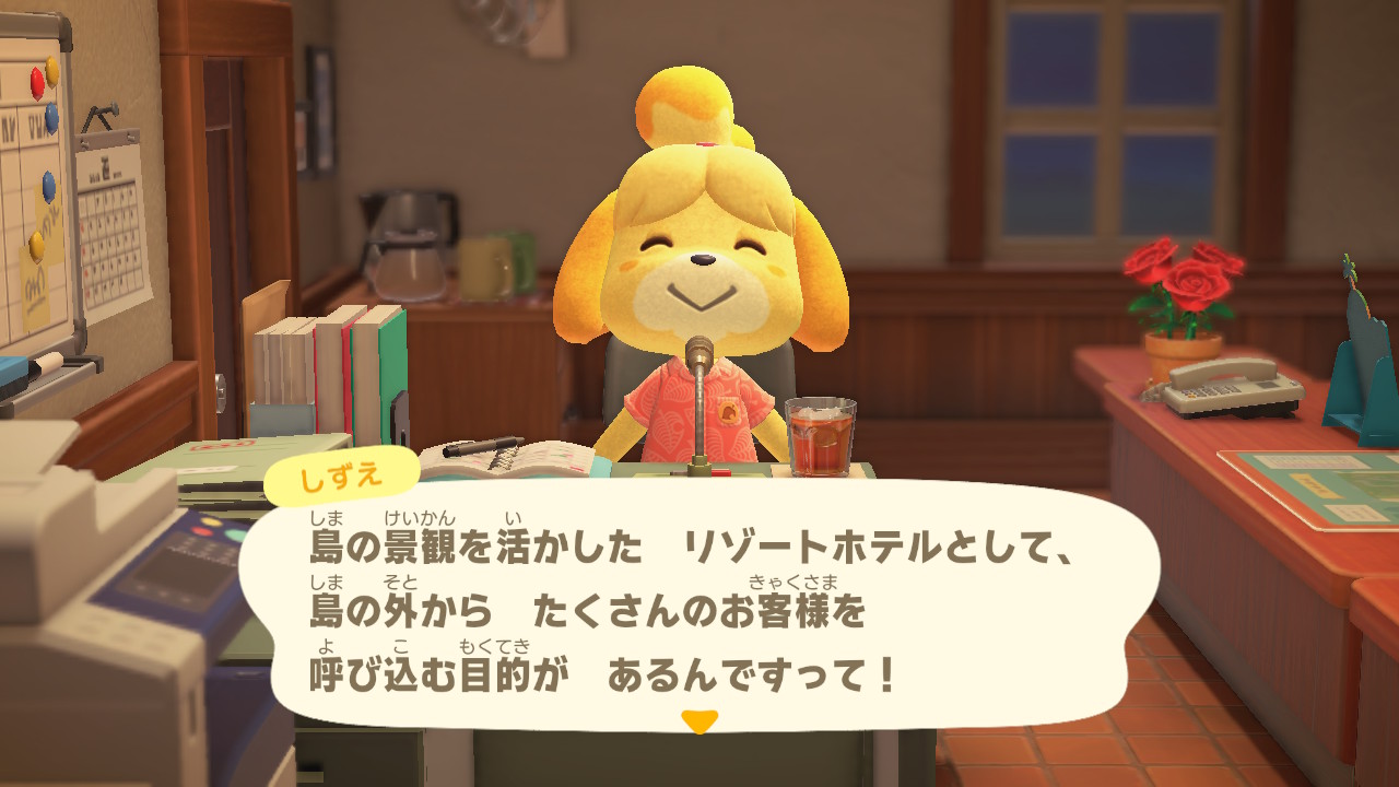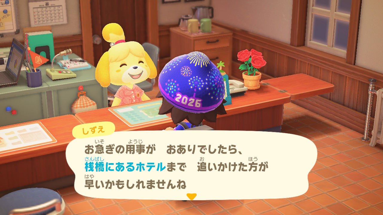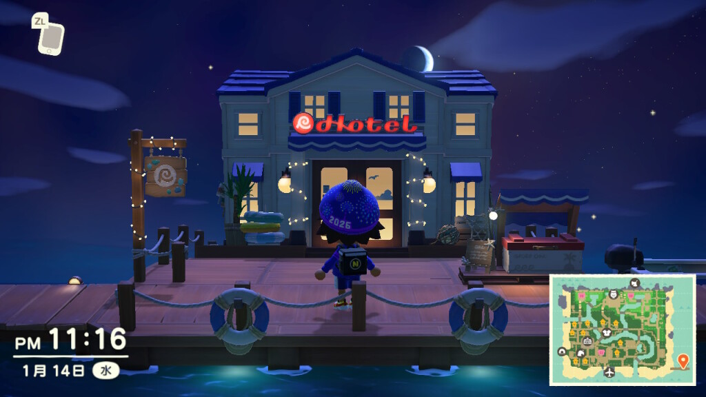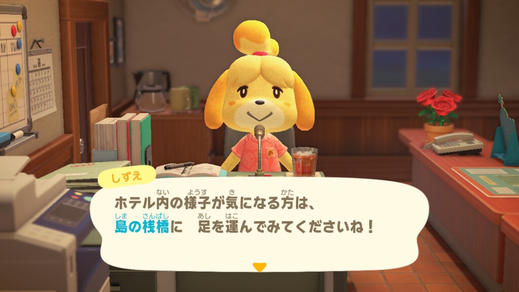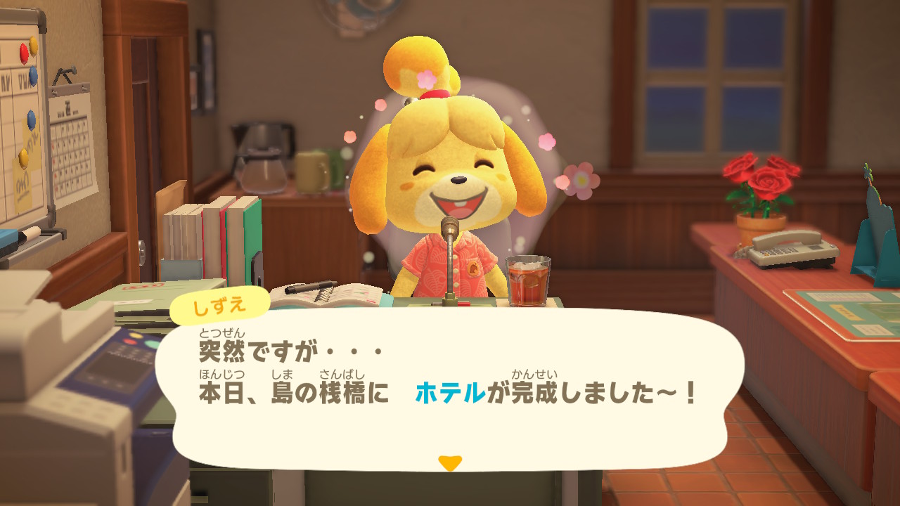 この「あつ森 3.0」も、2.0のとき同様に多岐にわたるアップデートが行われているそうなのですが、最大のニュースは、桟橋に新しくホテルが建てられたことでしょう。この日はたまたま、アップデート後に最初のゲーム起動となったのですが、しずえさんの島内放送のトップニュースは、やっぱりホテルでした。