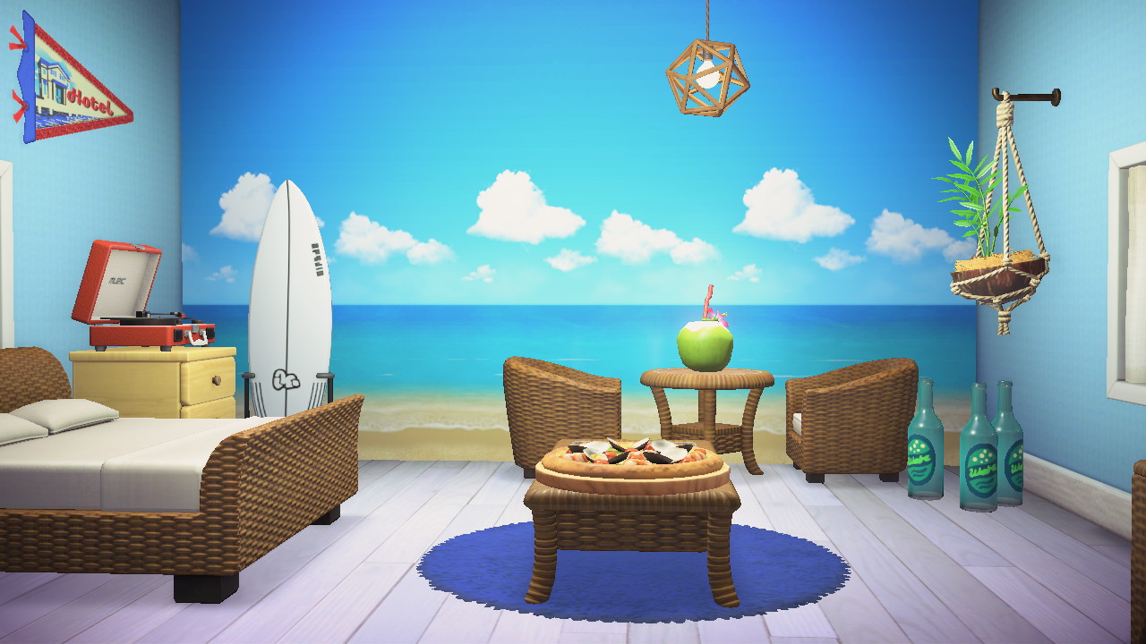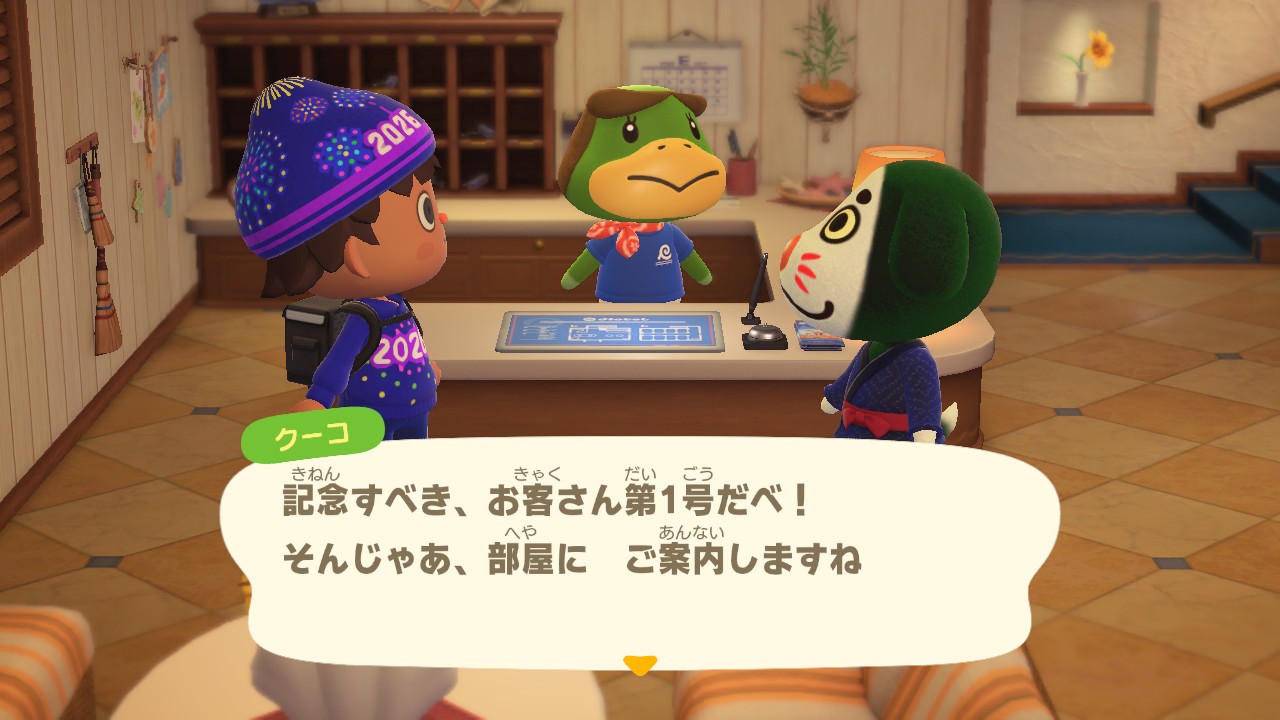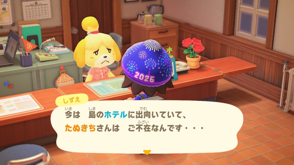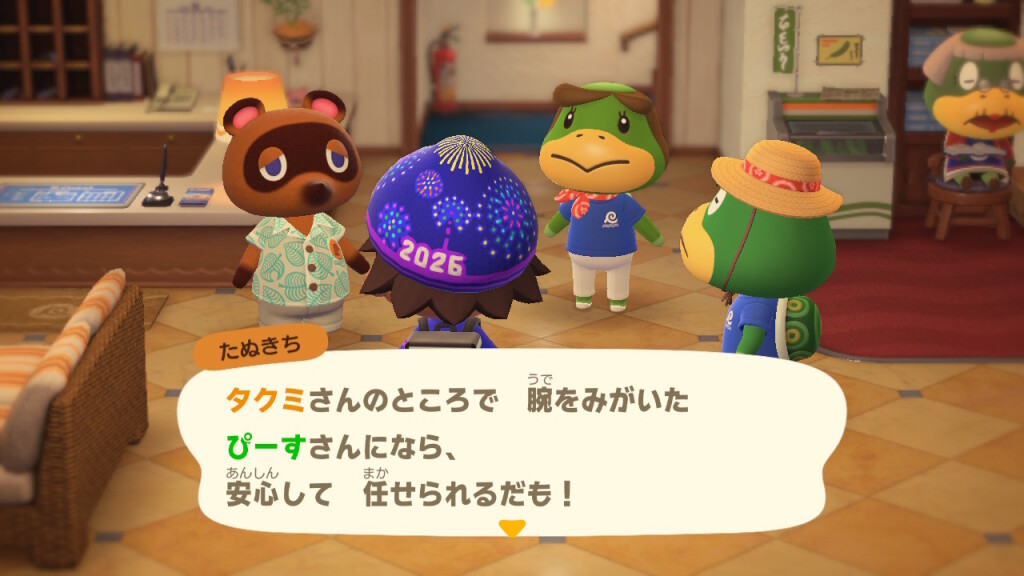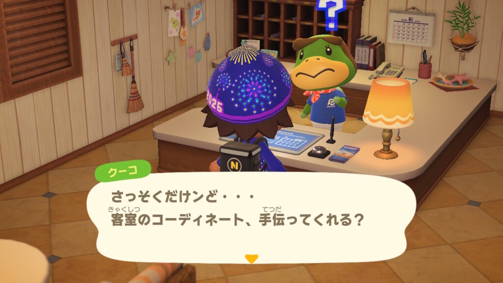島の住民であるプレーヤーは、ホテルの部屋のコーディネートを任されます。我らがぴーす君の場合は、追加コンテンツの「ハッピーホームパラダイス」も導入済みということで、「安心して任せられるだも!」とヨイショされます。そうでない場合は、「普段の自宅と同じようにやってくれれば…」のように言われるようです。
