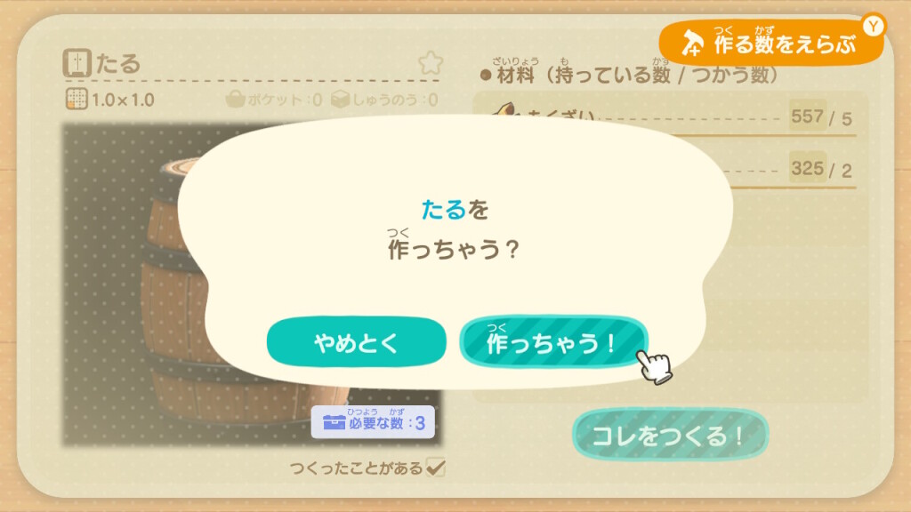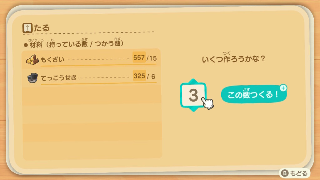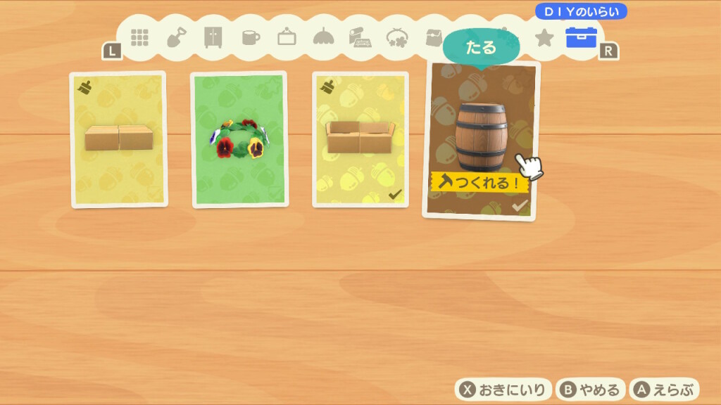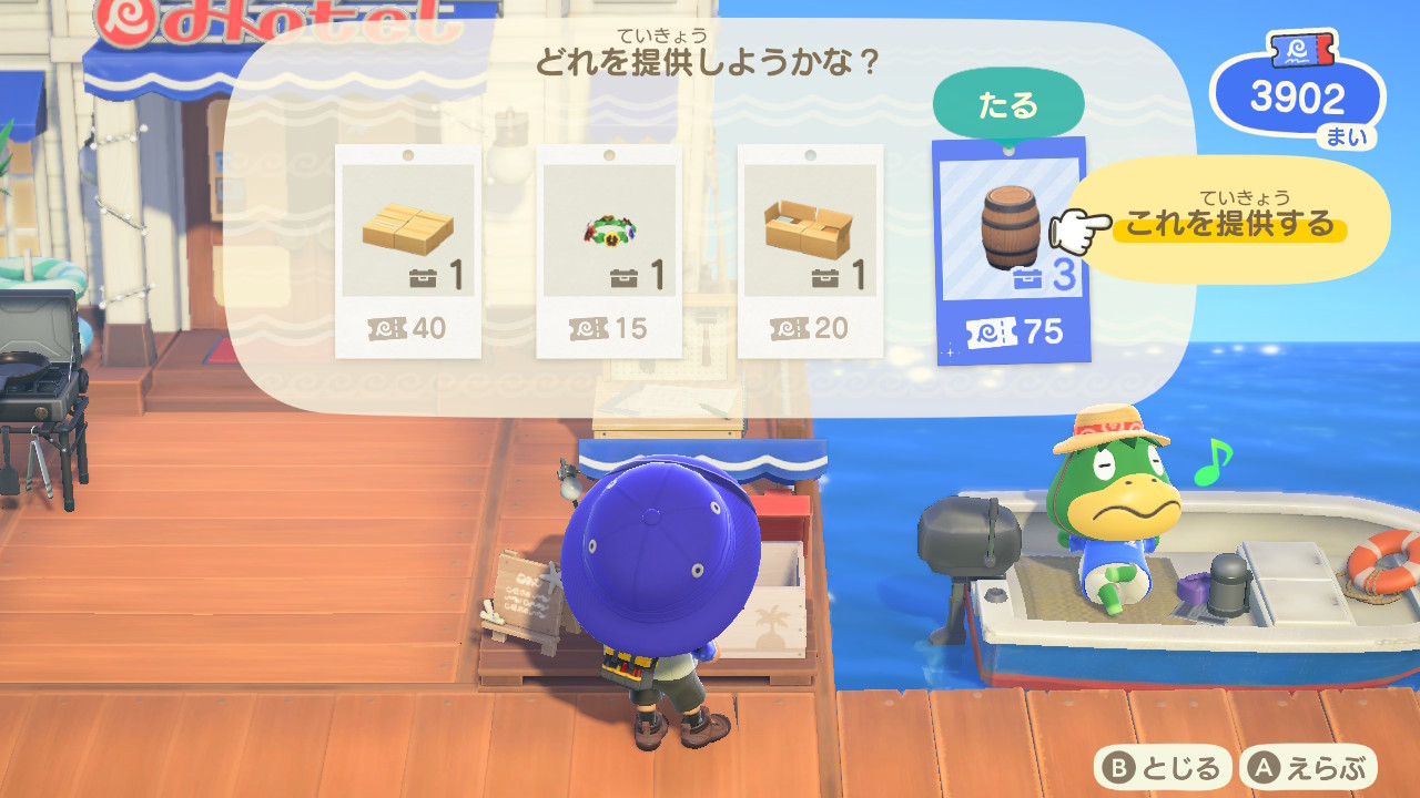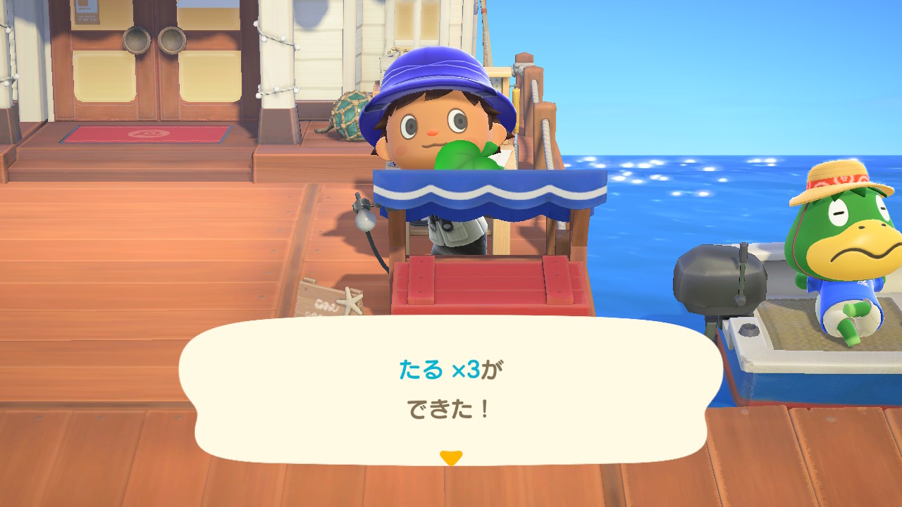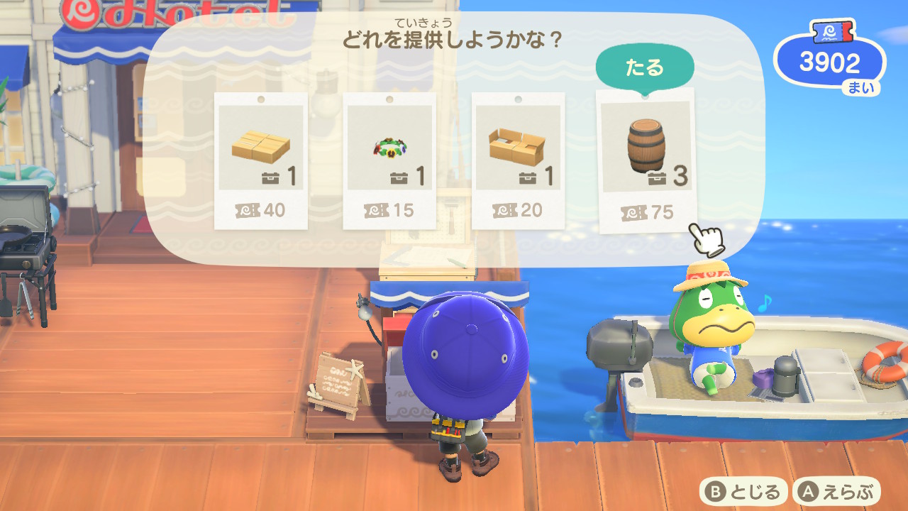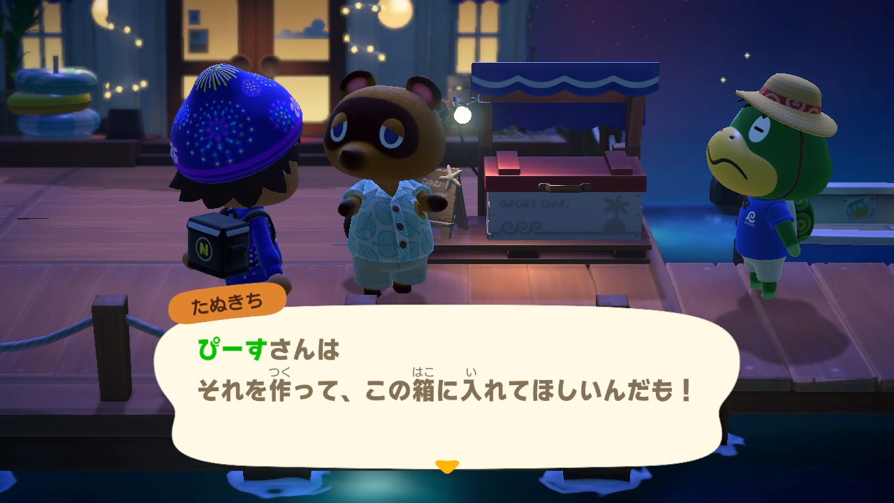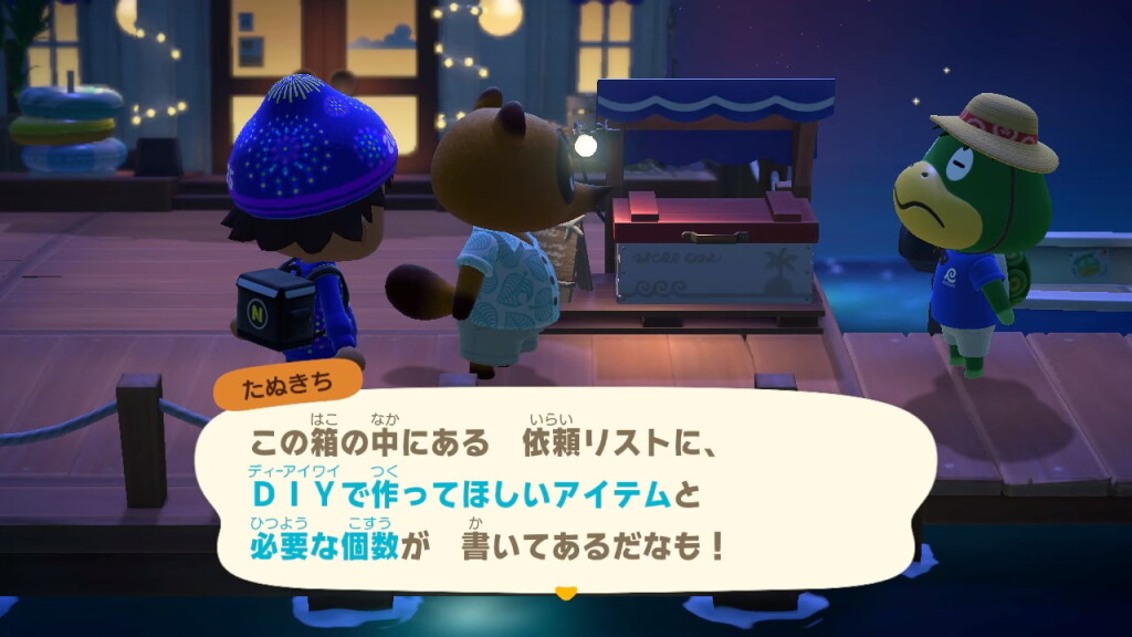 また、ホテル前に置かれたボックスに、オーダーされた「名物」をDIYして入れていくと、島の外に売って宣伝に使われるようです。ご褒美にホテルのクーポンをもらえるのですが、材料は用意してくれないので、自分で調達しなくてはなりません。相変わらずたぬきちは島民の資産や労力、何よりやりがいを搾取するクセが抜けません。それに乗せられる自分たちも自分たちなのですが…(苦笑)。