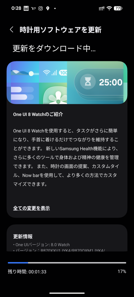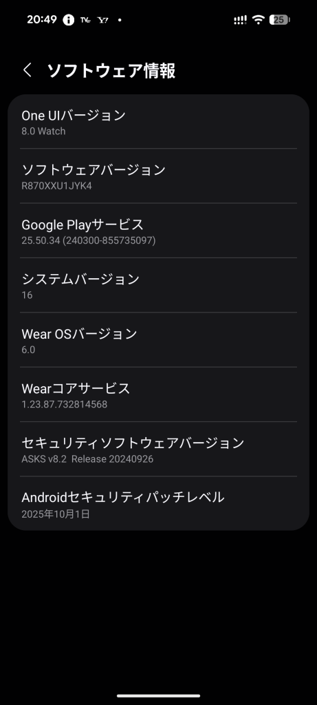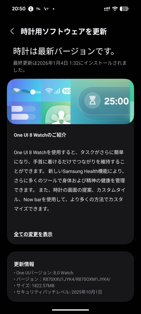 そんなGalaxy Watch4に、昨年末にアップデートが配信されてきました。説明書きによると、「One UI 8.0 Watch」へのアップデートらしく、データのサイズは2 GB近くありました。なかなかダウンロード及び時計本体へのセットアップに成功しなかったのですが、ようやく年明けの1月4日にインストールが済みました。