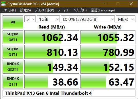 使うときに気をつけたいのが、接続先のポートの仕様です。CF-SV8のUSB 3.0ポートや、ThinkPad X13 Gen 6 Intel本体のUSB Type-Aポート(USB 3.2 Gen 1)は、データ転送速度が最大5 Gbpsなので、CrystalDiskMarkで測ると、シーケンシャルアクセスが最大でも450 MB/s強に留まります。