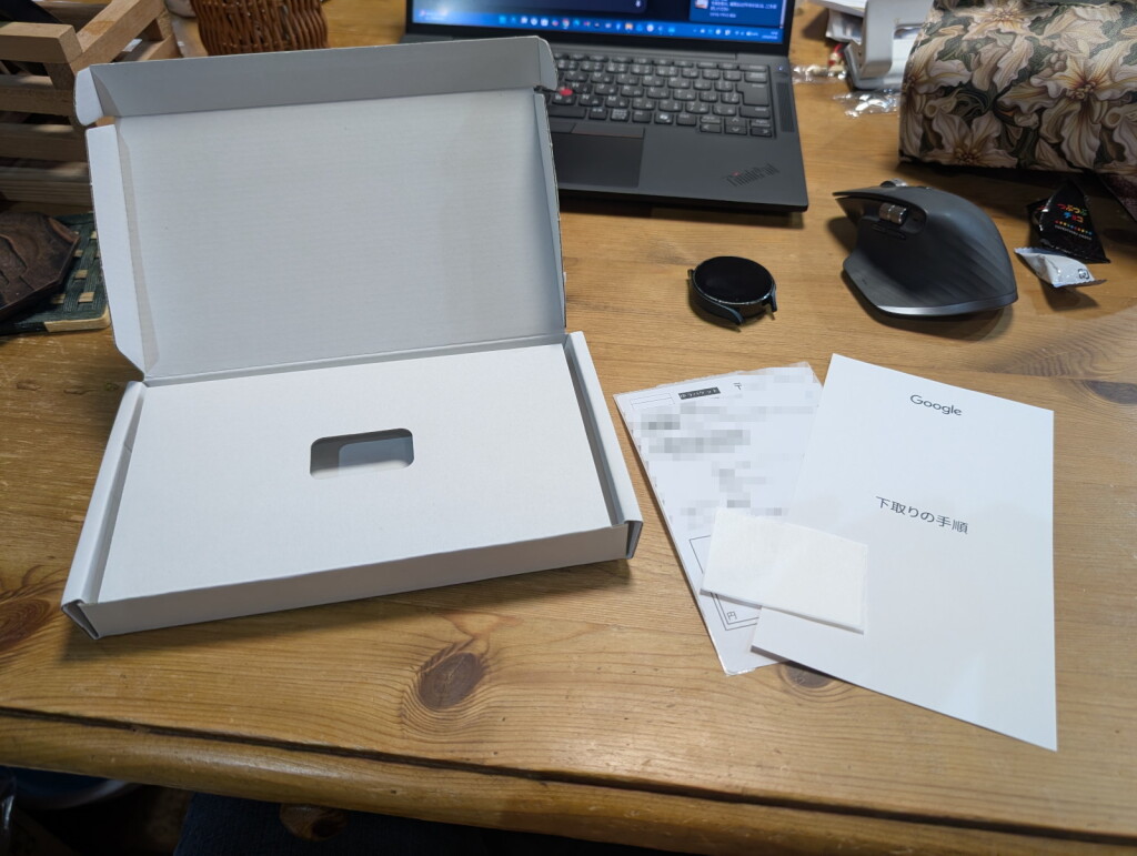 商品のPixel Watch 4が届いた直後に、下取り品を送るするためのキットが送付される…と案内されていましたが、我が家にはPixel Watch 4が届いた翌々日に、小さな白い箱が届きました。早速中を開けてみると、手順説明の紙1枚と返送用の荷札、そして返送時に封をするための白いシールが入っていました。