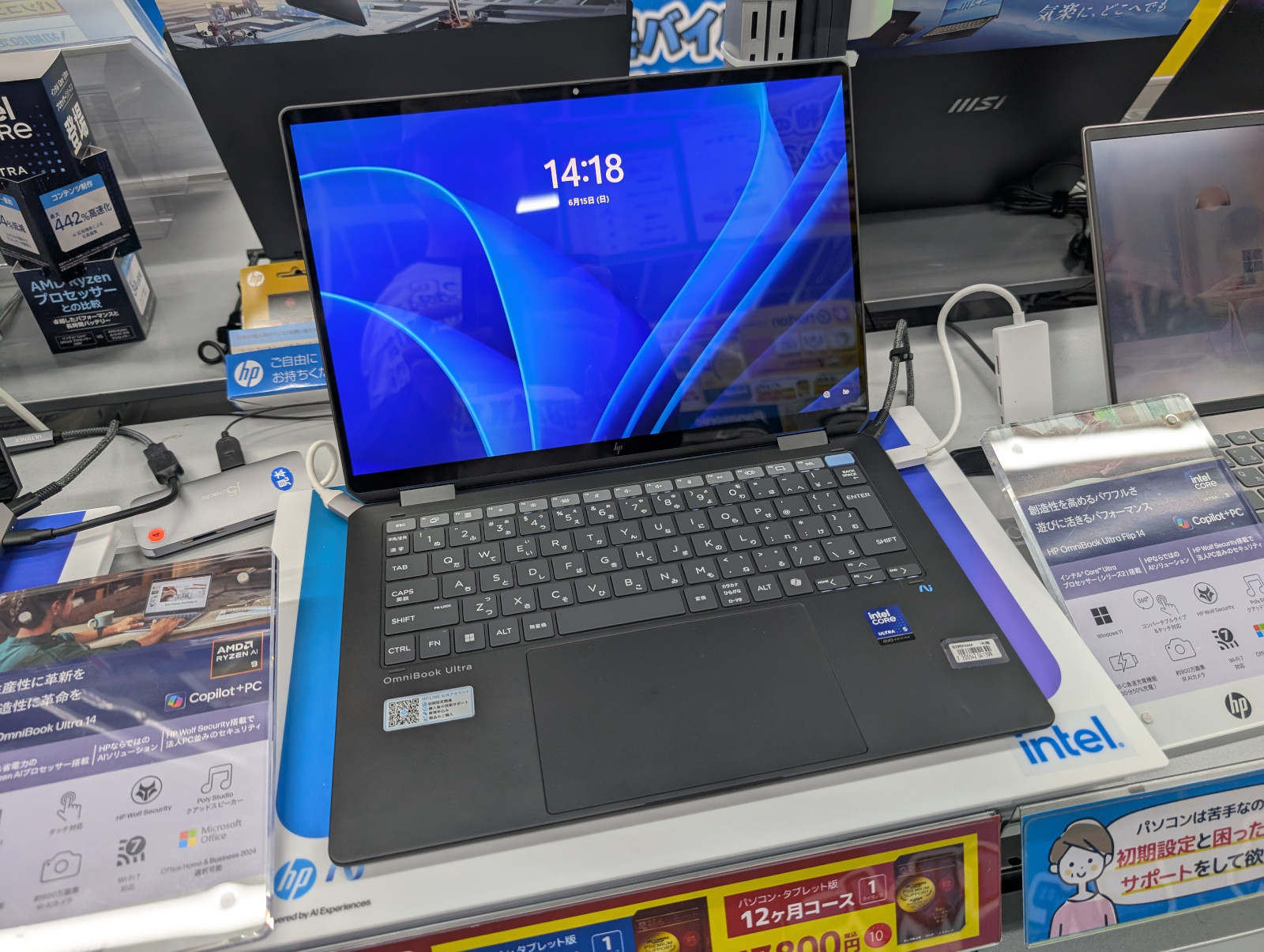 先に触れたとおり、ビックカメラ 名古屋駅西店には、直販限定のダイレクトモデルをその場で見て注文できる「HP Directplus Station」があるのですが、そこではなく量販店モデルがいろいろと展示されている中に、Omnibook Ultra Flip 14-fhがあるのを見つけました。量販店モデルなのでプロセッサーはIntel Core Ultra 5 226V、RAMは16 GBということになり、ダイレクト販売の上位モデルとの性能差がかなりありそうですが、筐体自体は上位モデルと全く同じなので、触れてみる意味は大いにありました。